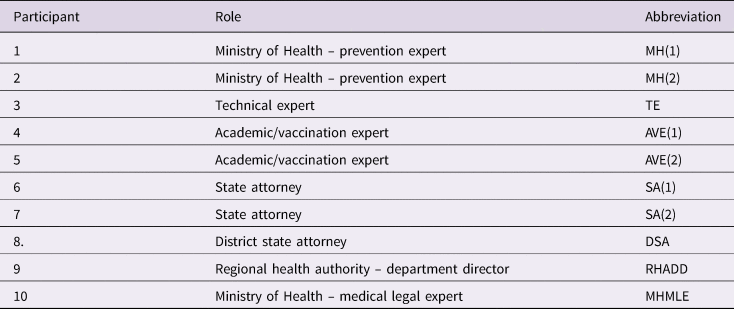 We augmented our documentary analysis with semi-structured face-to-face interviews with professionals inside or privy to the cases or the Italian health bureaucracy. We selected participants through purposive sampling (Flick, Reference Flick2018; McGaughey, Reference McGaughey2018) in light of their direct involvement in (or knowledge of) the Rimini and Milan decisions. Following ethics approvals, we conducted a first round of interviews in November 2018 and a second round in June 2019 (plus one interview in writing completed via e-mail three months later). The details of the recruited individuals are documented in Table 1.