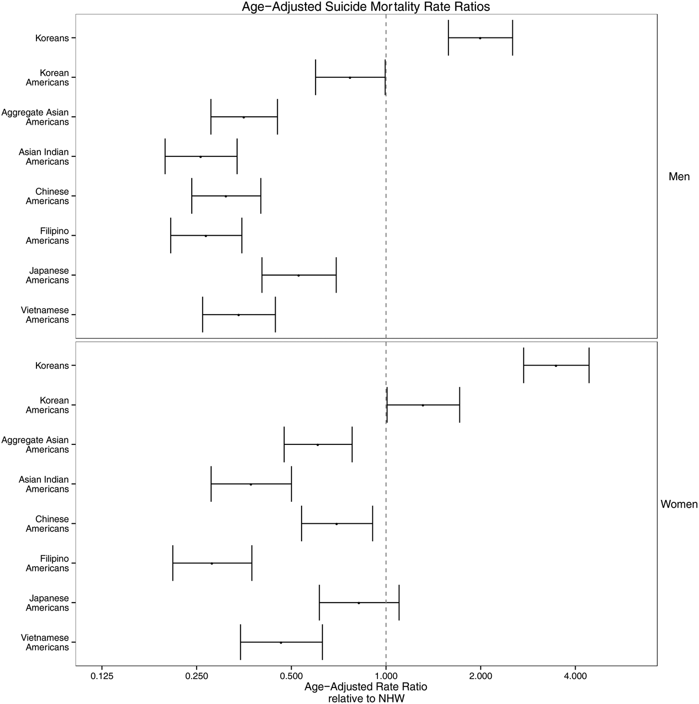 Fig. 1. Age-adjusted suicide mortality rate ratios in Korea and selected Asian American subgroups with Non-Hispanic Whites (NHWs) as the referent group. The x-axis is on the log scale.