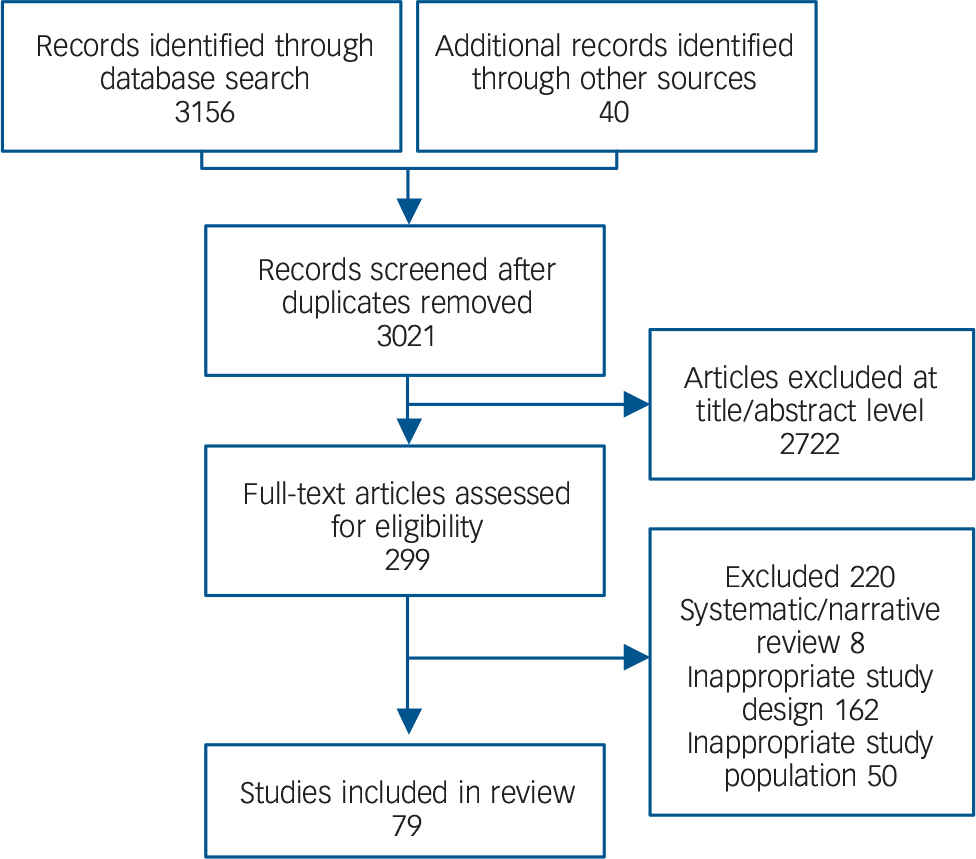Our search yielded 3021 non-duplicated publications, which were considered at the title and abstract level; 299 full texts were reviewed, of which 79 met inclusion criteria (Fig. 1). Reference Henry, Amminger, Harris, Yuen, Harrigan and Prosser10–Reference Evensen, Rossberg, Barder, Haahr, Hegelstad and Joa13,Reference Harrow, Grossman, Jobe and Herbener22–Reference Faber, Smid, Van Gool, Wunderink, van den Bosch and Wiersma96 Full details of the included studies are given in online Tables DS1 and DS2. There were 44 studies reporting on remission rates and 19 reporting on recovery rates, with 16 studies reporting on both remission and recovery, for a total of 79 independent samples. The final sample comprised 19 072 patients with FEP (range of sample sizes 13–2842); 12 301 (range 13–2210) with remission data and 9642 (range 25–2842) with recovery data.