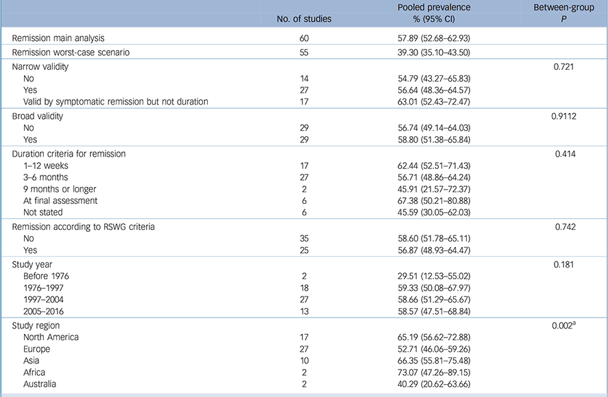 Full details of the proportion of people who experienced remission, together with heterogeneity and trim and fill analyses, are summarised in online Table DS3, and a shortened version is given in Table 1. Results of interest are briefly discussed below.