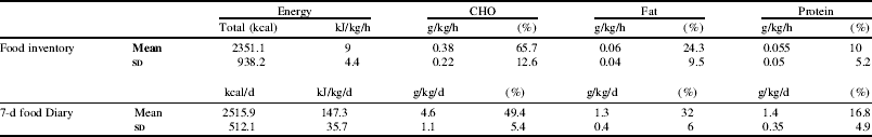 Twenty-three participants [19 males, 4 females; age: 18–72 years; BMI: 23.8 (sd: 3.2) kg/m2] entered in the Longmynd Hike [50 mile competition hike; mean completion time: 16.0 (sd: 3.2) h] completed a 7-d food dairy prior to the event; and a weighed food inventory of all items consumed during the event. Data on demographics, dietary preparation and race experience were obtained by questionnaires. Anthropometrical measures and physical performance tests (e.g. jump, grip and balance tasks) were performed before and after the race. All data are expressed as means (sd), statistical significance P⩽0.05.