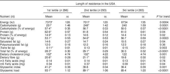 *Mean value was significantly different from that of the third tertile of length of residence in the USA: P<0·05.