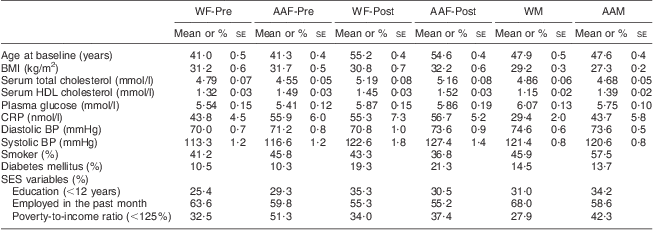 Descriptive statistics, indicators of risk for developing CVD and socio-economic variables are presented in Table 2. According to mean BMI values and regardless of race, the average male was classified as overweight and the average female was obese. Overall, 30·2 % of the sample was classified as overweight and 40·8 % as obese. With the exception of WF-Post (5·19 (se 0·08) mmol/l), mean total serum cholesterol for the participants was below the borderline–high risk range, 5·18 mmol/l, as defined by the American Heart Association (Table 2). Means for CRP were found to be ≥28·6 nmol/l across the entire sample and ranged from 29·4 (se 2·0) to 56·7 (se 5·2) nmol/l. About 48 % of the total population smoked cigarettes, with African Americans having the higher percentage (50·4 %). On average, diabetes afflicted 14 % of the study sample. The highest percentage of individuals with diabetes was found among postmenopausal women (Table 2). Approximately a third of the sample did not complete high school. Nearly 40 % were not employed. Poverty was also a major factor, with 39 % falling below 125 % of the poverty level.