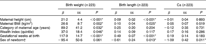 * P values were significantly different for birth weight, birth length and Ca by covariates (P < 0·05).