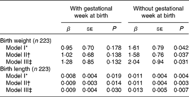 Considering that the gestational weeks at birth would be an intermediate factor, the aforementioned three multivariate analyses were also conducted without the gestational weeks at birth (Table 3). The multivariate regression analysis without the gestational age at birth revealed the significant relationships between size at birth and Ca in the three models (birth weight, model I: P = 0·042; model II: P = 0·037; model III: P = 0·031; birth length, model I: P = 0·004; model II: P = 0·003; model III: P = 0·007).
