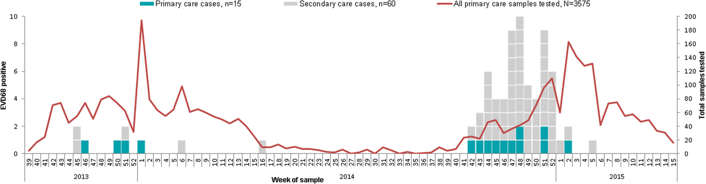 This study aimed to quantify the circulation of EV-D68 in England in primary and secondary care before and after the identification of EV-D68 in North America in autumn 2014. Our objectives were (i) to determine whether there was an increase in number of cases between autumn/winter 2013–2014 and autumn/winter 2014–2015, and (ii) to describe the clinical presentation and phylogenetic characteristics of this virus, including severity in England in the autumn/winter 2014–2015.