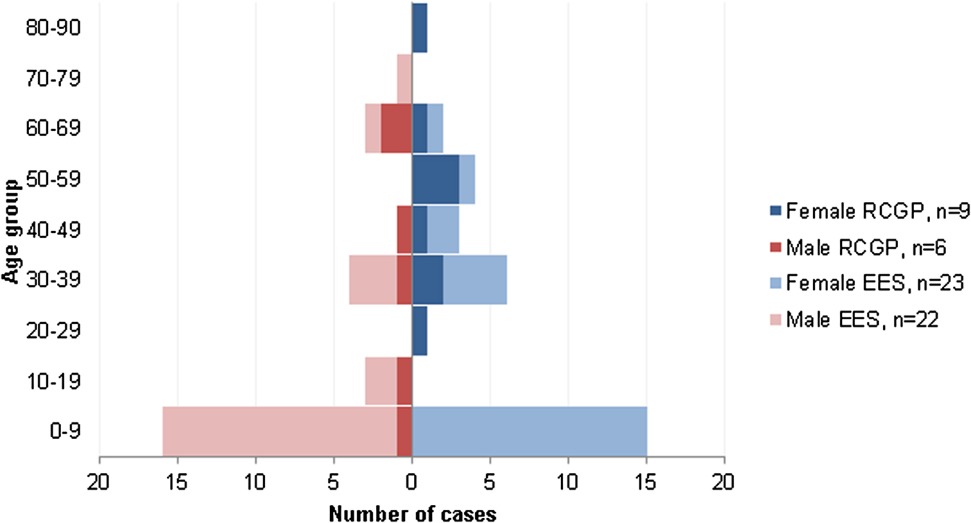 Fig. 2. Number of EV-D68 cases by sex, age, and surveillance system where detected, England, September 2013 to January 2015. (RCGP influenza sentinel surveillance system (primary care) and EES (secondary care)).