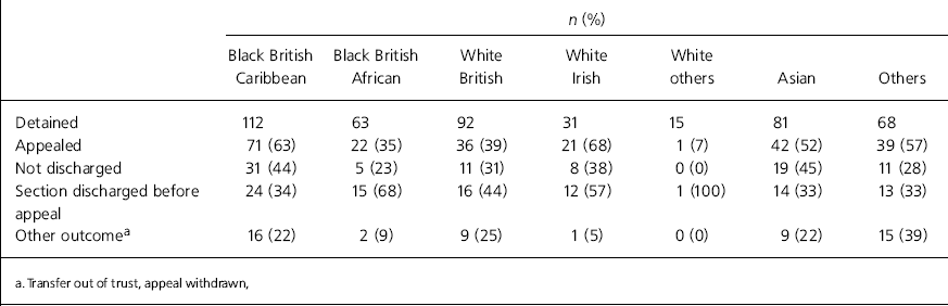 A previous study showed the rate of discharge from section after appeal to be 15%. Reference Crimlisk and Phelan17 In another study, O’Dwyer & Neville looked at a series of 400 people detained under section 2. They found an appeal rate of 9% of eligible individuals; 16% of appellants were successful. Reference O'Dwyer and Neville18 In this study we explored the association between ethnicity and rates and outcome of appeal against detention under the Mental Health Act 1983.