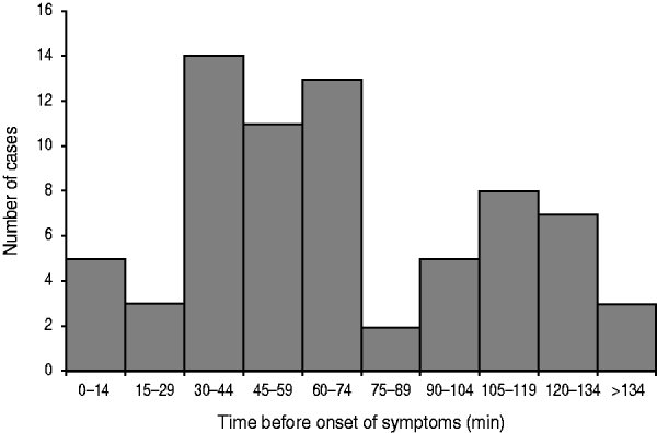 Fig. 1. Scombroid fish poisoning in Dakar (Senegal); time to onset of symptoms (n=71 cases).