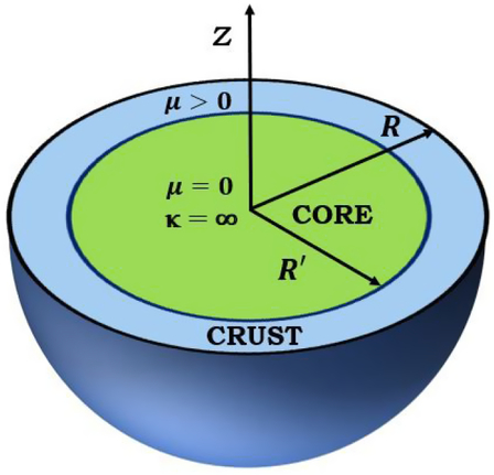 In this section, we study in detail the FLE model (Franco et al. Reference Franco, Link and Epstein2000), where the star is described as a homogeneous body, with a fluid core and an elastic crust of the same density. Here we present briefly only the main characteristic of the model; for the complete derivation, we refer to the original paper by Franco et al. (Reference Franco, Link and Epstein2000).