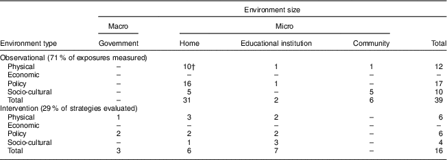 Studies were mapped against environmental size (i.e. macro and micro setting). There were few studies within the government setting, with only three intervention strategies( Reference Tandon, Wright and Zhou 36 – Reference Birch, Johnson and Jones 38 ) and no observational exposures evaluated in this setting. Most studies were undertaken within the home setting (thirty-seven exposures/strategies out of fifty-five), primarily in observation studies (thirty-one out of thirty-seven). The majority of research within educational institutions has been from intervention studies; seven strategies( Reference Musher-Eizenman, Young and Laurene 3 , Reference Arcan, Hannan and Himes 39 , Reference Zask, Adams and Brooks 46 , Reference Bevelander, Anschutz and Engels 54 ) were identified compared with two exposures from observational studies( Reference Vereecken, Huybrechts and Maes 53 ). A total of six exposures have been examined within the community setting, all from observational research( Reference Erinosho, Dixon and Young 26 , Reference Lopez, Ayala and Corder 27 , Reference Ayala, Rogers and Arredondo 29 , Reference Spurrier, Magarey and Golley 41 , Reference Buck, Bornhorst and Pohlabeln 48 , Reference Kerr, McCrorie and Rennie 51 ).