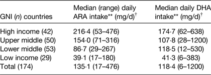 Table 1. Per capita estimated daily intakes of arachidonic acid (ARA) and DHA by gross national income (GNI) of country in 174 countries( Reference Forsyth, Gautier and Salem 16 )