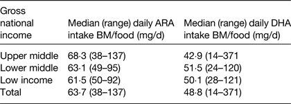 Table 2. Estimation of arachidonic acid (ARA) and DHA dietary intakes from breast milk (BM) and complementary foods (food) in 6–36 months old children living in seventy-six developing countries ( Reference Forsyth, Gautier and Salem 17 )