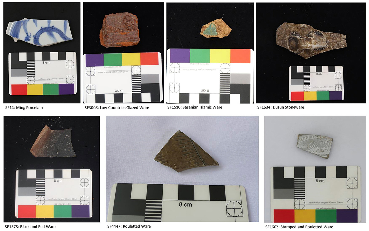 In addition to European-produced artefacts, pre-colonial contact materials were successfully recovered, particularly from excavations close to a new septic tank (Figure 5). Black and Red Ware, Dusun Jars, Early Islamic glazed wares, Rouletted Ware and Ming porcelain were excavated from contexts without European-contact artefacts, confirming the pre-colonial significance of Jaffna Fort. Importantly, new ceramic types were identified, including sherds exhibiting rouletting and stamped radial designs, illustrating both Jaffna's uniqueness and central place within international Indian Ocean networks (Figure 6). Unfortunately, these finds were from within mixed deposits above the natural bedrock. While we await scientific dating confirmation, the terminus ante quem for the earliest phases is estimated to be the seventh or eighth century AD, although many individual items date to the first millennium BC.