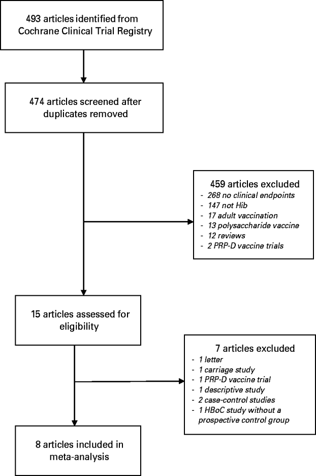 The search strategy yielded 493 references (Fig. 1). After removing duplicates, 474 titles and abstracts were screened and 459 papers excluded. The most common reason for exclusion at this stage was that the study reported only safety and immunogenicity of the vaccine with no clinical endpoints. Fifteen papers were retrieved for full-text review and seven of these were excluded. One of the excluded studies was a large, Finnish prospective study where children born on even-numbered days received HbOC vaccine and those born on uneven-numbered days received PRP-D vaccine [Reference Peltola24]. Vaccine efficacy was estimated by comparing the number of Hib disease cases during the study period with the number expected based on historical routine surveillance data. The study was excluded because the comparison group was historical, not prospective.