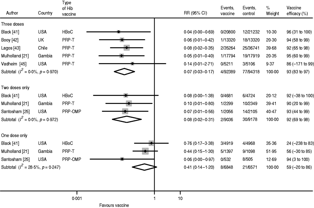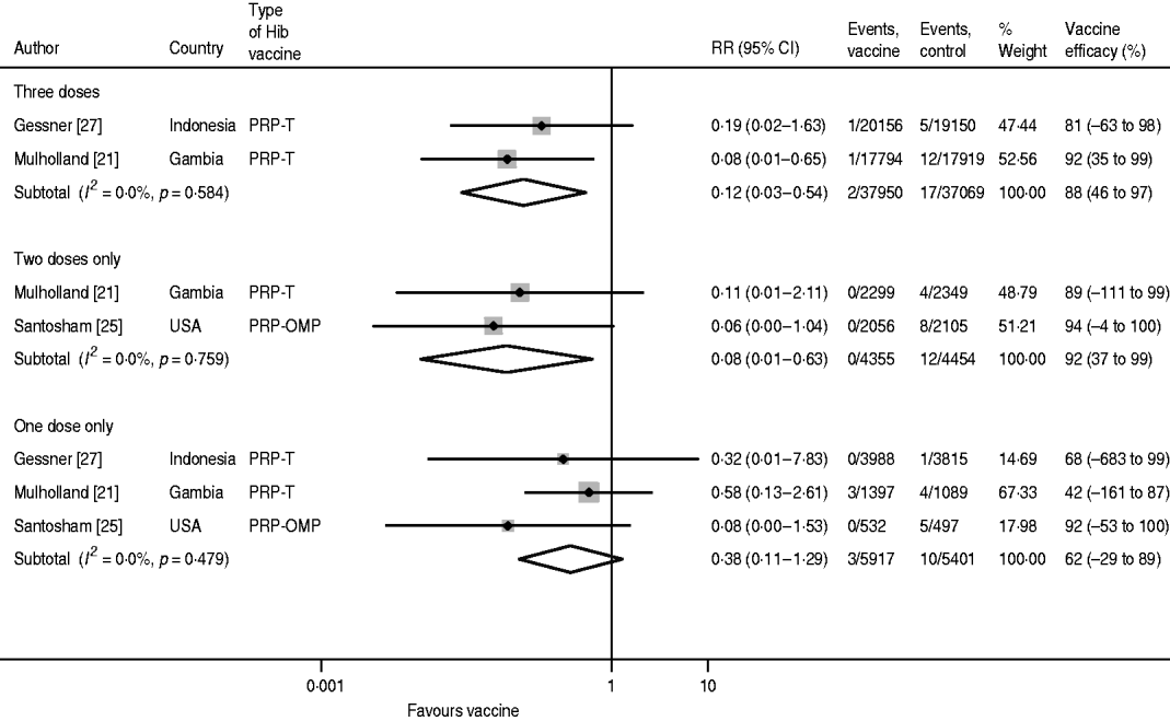 All the studies demonstrated high vaccine efficacy against confirmed invasive Hib disease following two and three doses, and there was no heterogeneity in the pooled estimate. With one dose, the pooled estimate was 59% (95% CI −20 to 86) and there was only low heterogeneity. Hence, the vaccine efficacy evidence against invasive disease is convincing and robust for all dose regimens. This conclusion is similar to the findings of O'Loughlin and colleagues in their meta-analysis of observational studies [Reference O'Loughlin14]. The pooled vaccine effectiveness estimate against invasive Hib disease from three case-control studies was 95% (95% CI 82–99) after three doses and 92% (95% CI 81–97) following two doses. In the meta-analysis of RCTs by Obonyo & Lau, vaccine efficacy against invasive Hib disease after three doses was only 84% (95% CI 69–92). The reason for the higher pooled estimate in the new analysis is partly the exclusion of the PRP-D trials, but also that Obonyo & Lau combined all doses into one analysis, so that children receiving only one dose, only two doses and all three doses were included in the same estimate.