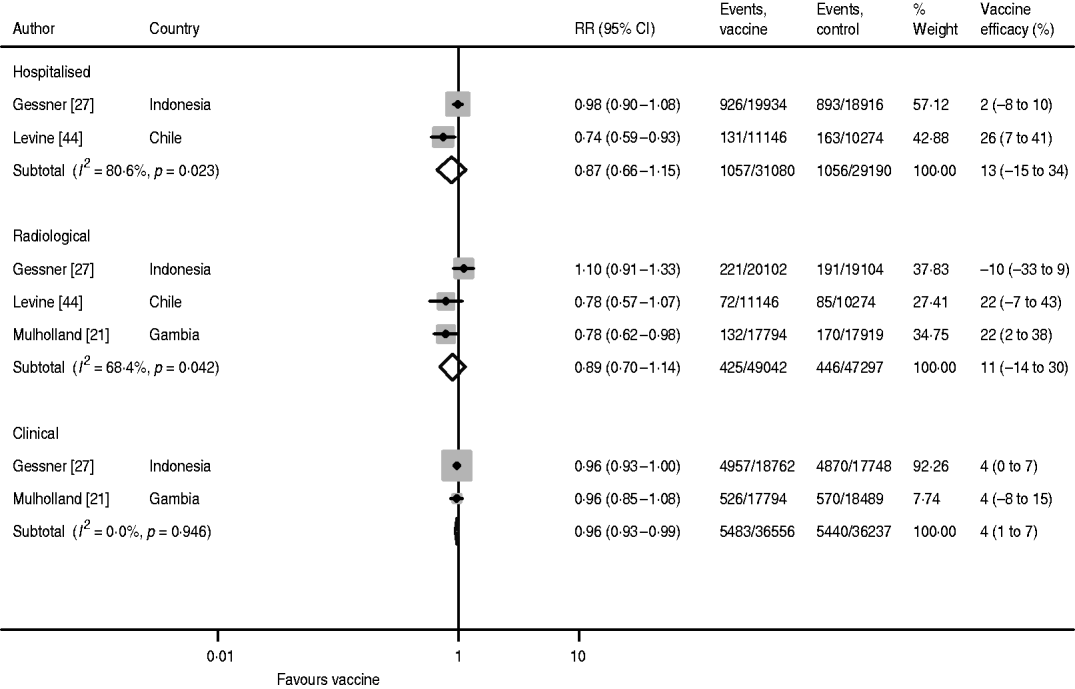 It must be emphasized that the radiological pneumonia outcome measure imposes a large risk of bias due to the many definition problems of reading chest X-rays. This was particularly illustrated in the case-control study from Bangladesh where chest radiographs were taken of 2679 children with clinical pneumonia [Reference Baqui29]. According to per-protocol readings, 17·7% cases were identified as having radiologically confirmed pneumonia. However, when the radiographs were read by a WHO panel, it was concluded that 26·0% were radiologically confirmed, and only 13·2% of cases were radiologically confirmed by both per-protocol readings and WHO readings [Reference Baqui29]. It is thus difficult to determine which estimate to use, and the choice greatly affects the vaccine effectiveness estimate. When using the per-protocol readings, the preventable fraction for radiologically confirmed pneumonia was 17% following at least two doses of Hib vaccine. When the WHO readings were used, the vaccine was associated with 15% protection, and when the subset considered positive by both sets of readings was used the vaccine offered 34% protection [Reference Baqui29].