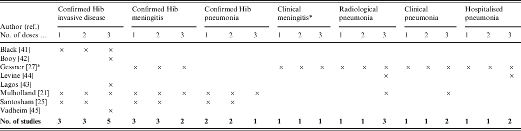 The following outcomes were included in the meta-analysis: (i) confirmed invasive Hib disease, (ii) confirmed Hib meningitis, (iii) confirmed Hib pneumonia, (iv) clinical meningitis, (v) radiologically (or chest X-ray) confirmed pneumonia, (vi) hospitalized pneumonia and (vii) clinical pneumonia. In addition, efficacy estimates were calculated according to the number of doses of Hib vaccine received as either (i) only one dose, (ii) only two doses or (iii) three doses.