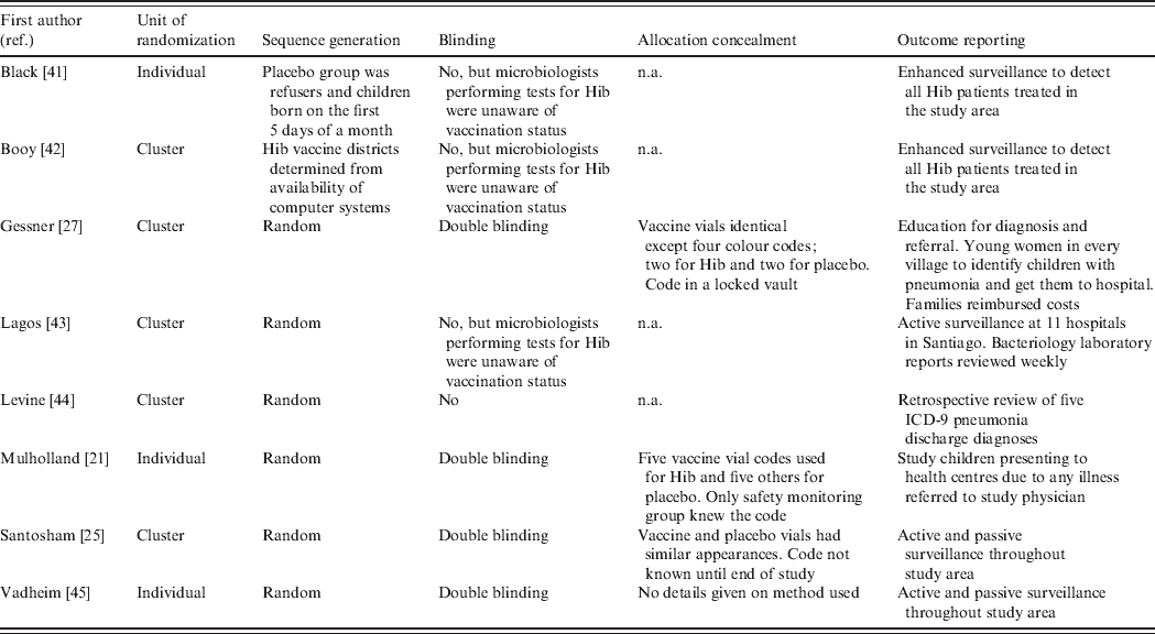 Data extraction and quality assessment were performed by two authors independently (U.K.G. and A.C.). Extracted data included setting, type of Hib vaccine, schedule, dosage, duration, number of Hib disease cases according to study group, and total numbers of children in both groups. Cochrane's Risk of Bias tool was used to assess the methodological quality of the trials [Reference Higgins and Green17].