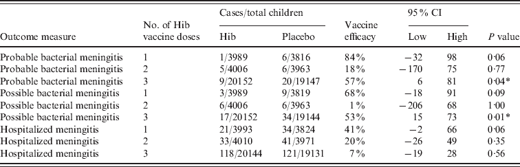 Fig. 3. Hib vaccine efficacy against confirmed Hib meningitis.