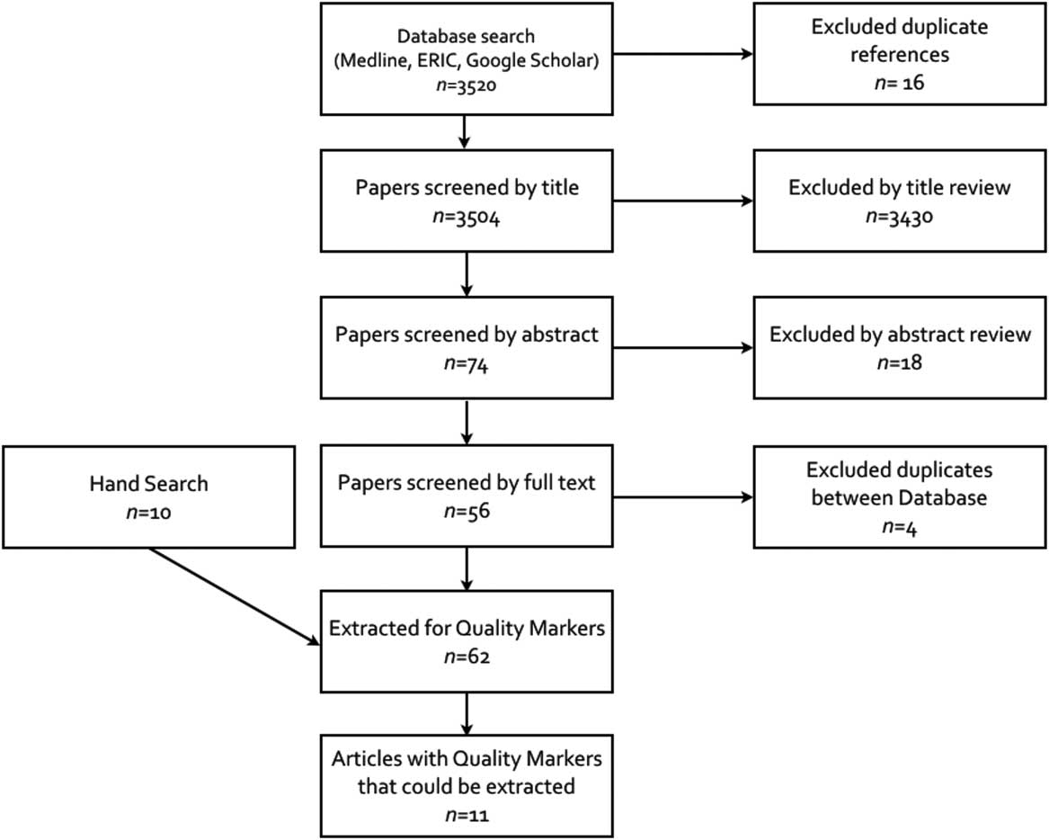 Our primary aim was to develop a literature-based set of quality markers for qualitative research, which we defined as items that were written as advice to authors of qualitative research that were not already within known qualitative scoring systems. To identify candidate quality markers, a single investigator (TMC) read the full-text articles remaining from the literature search after inclusion criteria were applied. Quality markers mentioned in the text, diagrams, figures, or tables were extracted into a master list.Reference Sebok 24 These quality markers were combined into one single master list, and then a close analysis was performed by a single investigator (TMC) to group and reduce this list in the manner described by Arskey and O’Malley into its final form.Reference Arskey and O’Malley 20 To enhance the rigour of this analysis, two investigators (DKT, JM) surveyed the analysis audit trail (i.e., the analysis documents) after reviewing the 11 full-text articles.