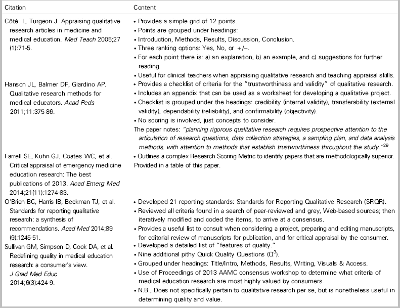 Our search identified five papers that had developed and reported checklists or scoring metrics useful for evaluating qualitative research (Table 3). The fifth paper by Sullivan et al. reported features useful for determining quality and value of both qualitative and quantitative research. These checklists would all be useful for consultation when designing a qualitative study, writing and editing manuscripts, performing editorial review of manuscripts, and performing critical appraisal of a qualitative paper.