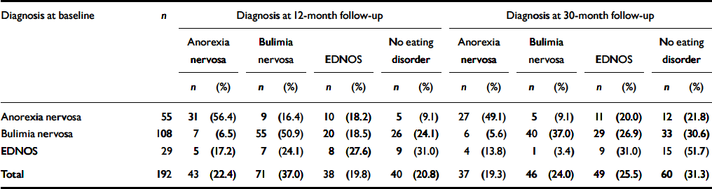 A subset of 192 participants had complete data-sets (i.e. they were assessed at all three time points). Their baseline diagnoses were as follows: 28.6% (n=55) anorexia nervosa, 56.3% (n=108) bulimia nervosa and 15.1% (n=29) EDNOS. Table 1 shows the distribution of their diagnoses at the two follow-up points classified by baseline diagnosis.
