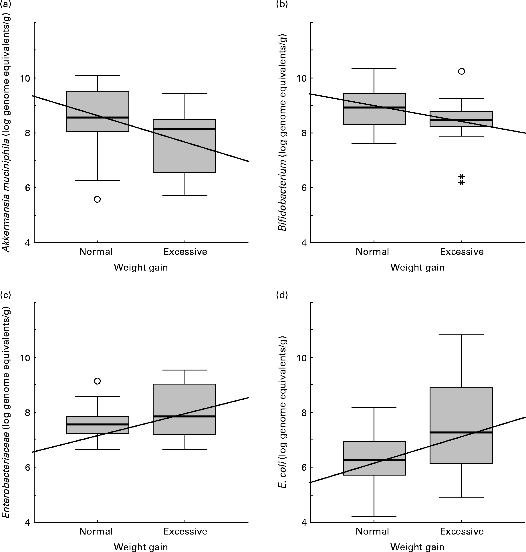 Fig. 2 Relationships between numbers of faecal bacterial groups and weight gain over pregnancy. Data represent the positive samples. The line in the box is the median (50 % percentile), with the lower line being the lower 25 % border (25 % percentile) and the upper line the 75 % (75 % percentile) border. The end of the upper vertical line is the maximum data value, outliers not considered. The end of the lower vertical line is the lowest value, outliers not considered. The separate dots or asterisks indicate outliers. Lines show the Spearman correlation (linear adjustment). (a) Akkermansia muciniphila (R − 0·34; P = 0·017); (b) Bifidobacterium (R − 0·31; P = 0·029); (c) Enterobacteriaceae (R 0·28; P = 0·050); (d) Escherichia coli (R 0·42; P = 0·002).