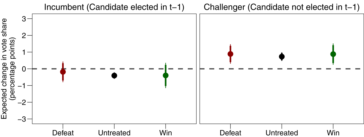 Turning to local elections (Figure 2) the patterns again do not support our hypothesis. The expected values for each treatment condition are virtually identical across the three conditions. Local councilors elected in the previous election tend to lose votes, whereas challenger candidates tend to increase their electoral support. Overall, the analyses of general and local elections do not offer any support for hypothesis 1.