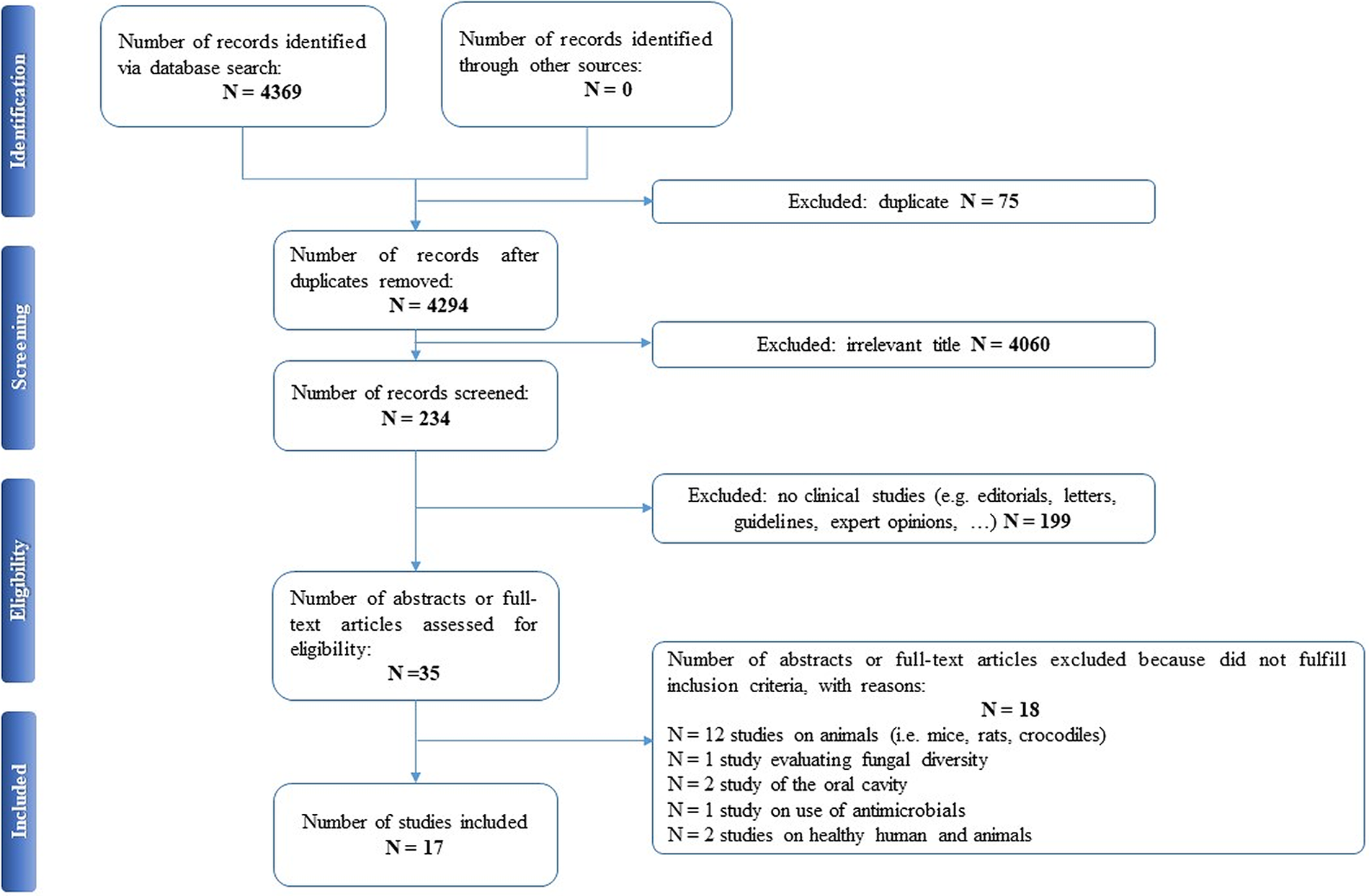Our search strategy resulted in 4,369 papers. After removing duplicates and irrelevant titles, only 234 articles were considered sufficiently relevant to warrant abstract review. Among them, 199 were excluded, because they were editorials, letters, reviews, systematic reviews, meta-analyses, guidelines, expert opinions, or different interventions, leaving 35 to be assessed for eligibility, with relevant references within these publications also identified and reviewed. Following the screening of literature according to inclusion and exclusion criteria, 18 studies were excluded, because they did not fulfill the inclusion criteria; the remaining 17 were included in the review. Table 1 describes the characteristics of these 17 studies.