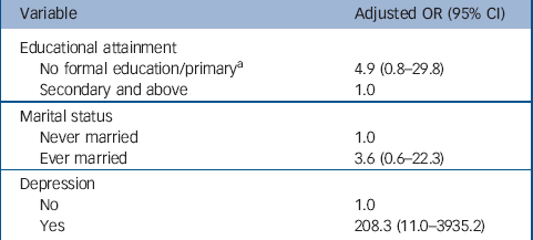 The multivariable conditional logistic regression model included the independent effects of ICD–10 diagnosis of depression, educational attainment and marital status adjusted for employment status (Table 2). There is overwhelming evidence of an association between depression and suicide after adjusting for education, employment and marital status (OR=208.2, 95% CI 11.0–3935.2). Suicide victims were more than three times more likely to have ever been married (OR=3.6, 95% CI 0.6–22.3) and about five times more likely to have received no formal education or only at primary level (OR=4.9, 95% CI 0.8–29.8) relative to controls. The interaction between employment and marital status was insignificant (likelihood ratio test, P>0.50). This could be noted as a limitation in terms of sample size leading to low power to detect the interaction that appears to be biologically meaningful.