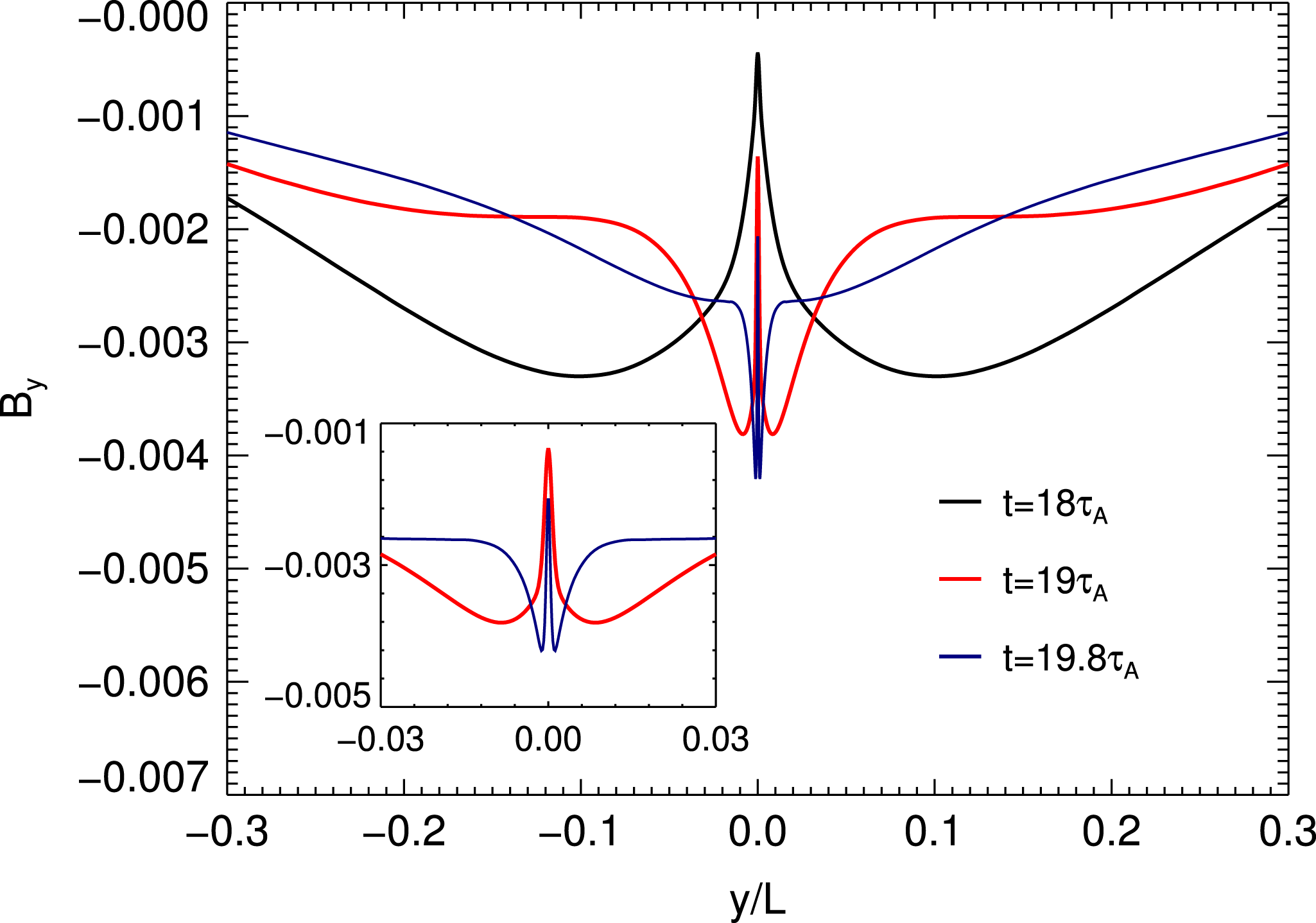 b), the ‘ideal’ mode being the only surviving one in the asymptotic limit; ‘ideal’ tearing onset, by breaking up the current on an ideal time scale, prevents the spontaneous formation of much larger aspect ratio current sheets, such as the Sweet–Parker one. Fully nonlinear MHD simulations show that the inner diffusion layer of the ideally reconnecting current sheet evolves during the nonlinear stage into an elongated secondary current sheet, that in turn becomes unstable to ‘ideal’ tearing at the local Alfvén time. This process of current sheet formation from of the inner diffusion layer proceeds in a recursive way at smaller and smaller scales, that can be accounted for by properly rescaling ‘ideal’ tearing to the local length of the sheet (Landi et al.