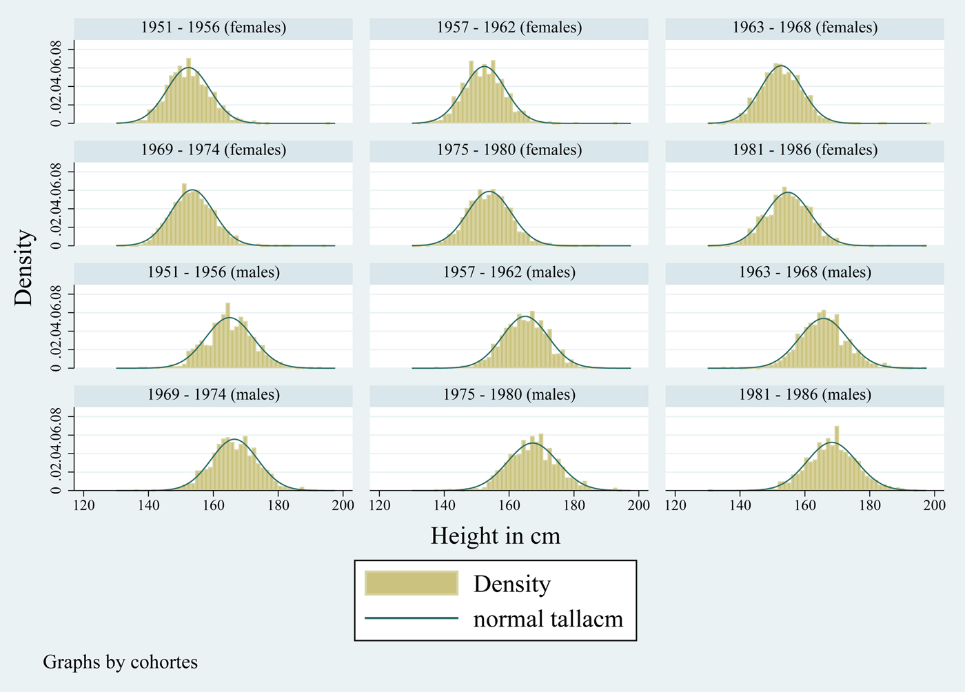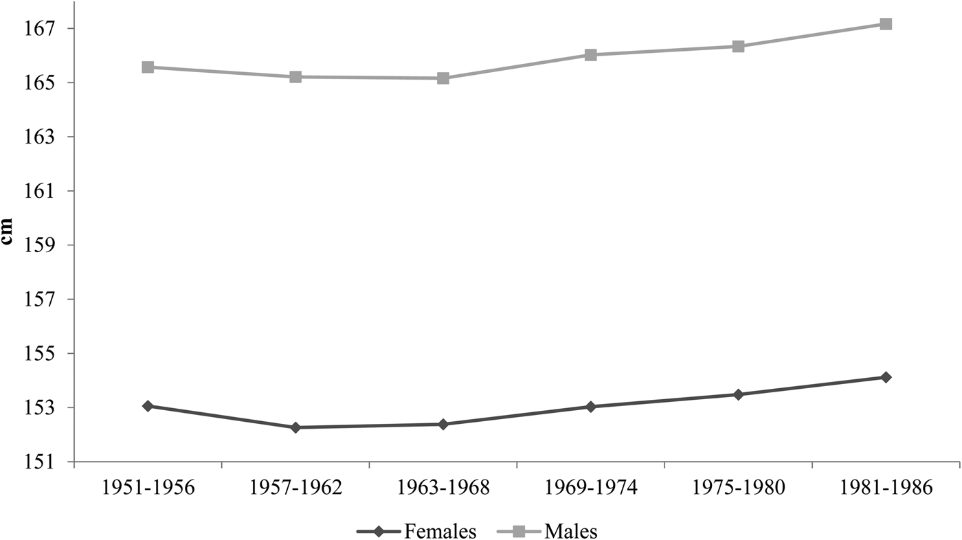 From these surveys, we were able to construct databases for adult men and women, beginning with those born in 1951. We built a longitudinal series that stops at individuals born in 1986. Following the normal procedure for historical databases, we took the heights of adults of ages ranging from 20 to 49 to ensure that we were not counting individuals who had not reached their final heights or who had begun losing heightFootnote 20. In order to control for age heaping practices and to get sample sizes that would be large enough we used 5-year cohort groups. Therefore, we work with six 5-years cohorts: 1951–1956, 1957–1962, 1963–1968, 1969–1974, 1975–1980 and 1981–1986Footnote 21.