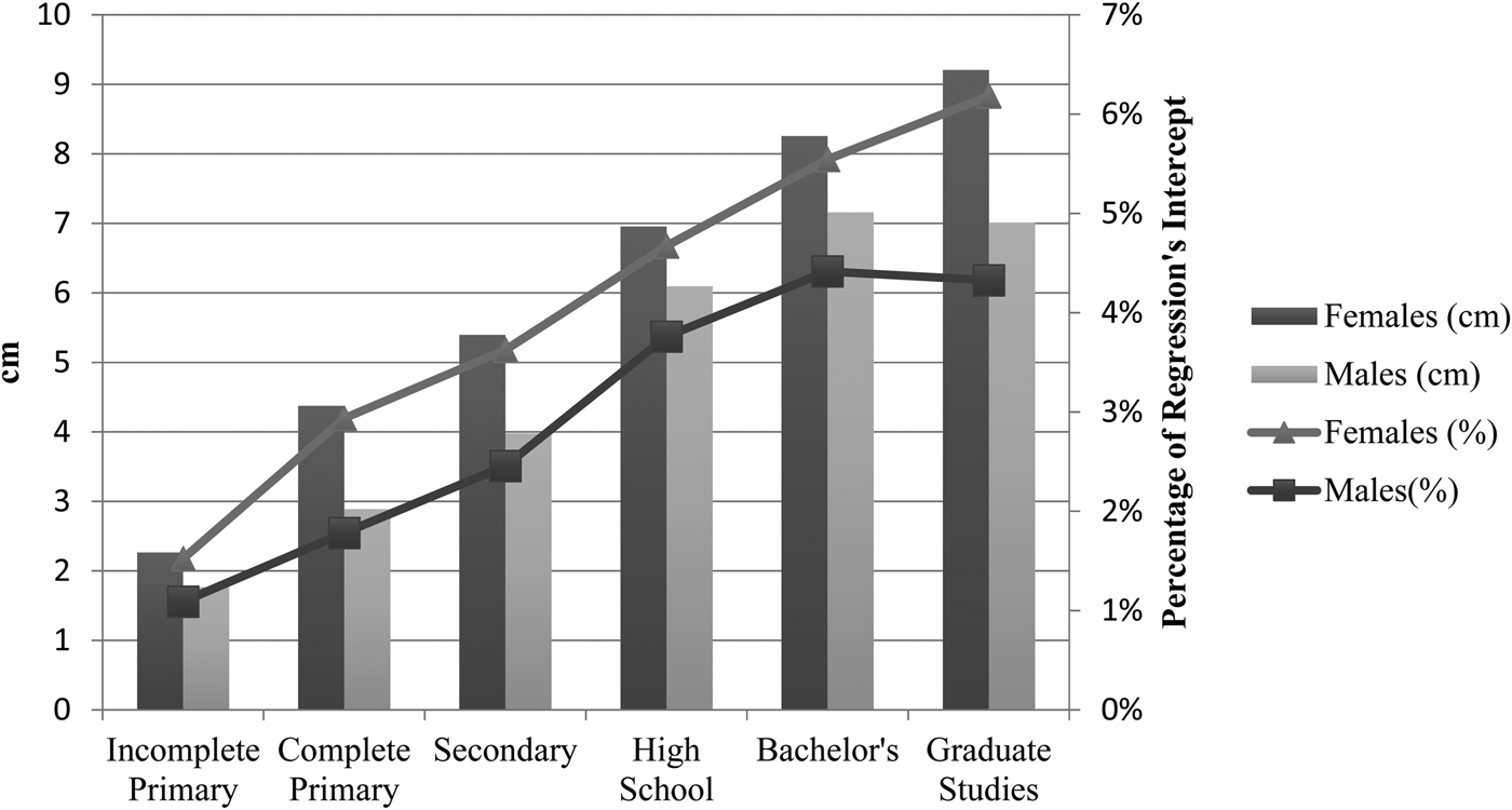 We look closer at the relevance of schooling as an indicator of human well-being and inequality. In Figure 3 we can trace the education penalty, the reference category as people with no schooling. Women with no schooling are shorter than those with incomplete primary education by 2.3 cm. The tallest individuals had more schooling, and the difference between those with graduate degrees and those with no schooling is 9.2 cm for women. Absolute differences between women are sharper than between men; the difference is larger when measured in relative terms (lines in Figure 3). This result highlights the fact that socioeconomic inequality captured by school attainment is more profound for females. This is evident that women are more vulnerable to the poverty and inequality trapsFootnote 33.