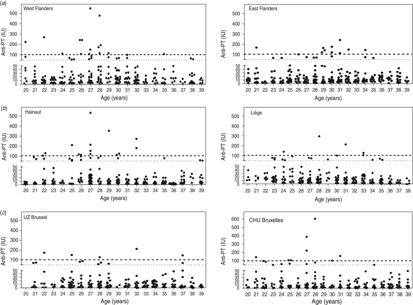 Fig. 1. Anti-PT antibody levels (expressed in IU/ml) detected in adults aged 20–40 years selected from two hospitals each in (a) Flanders, (b) Wallonia and (c) Brussels Capital Region. Cut-off values of 50 IU/ml and 100 IU/ml are indicated by a fine dotted line (····) and a bold dashed line (- - - -), respectively.
