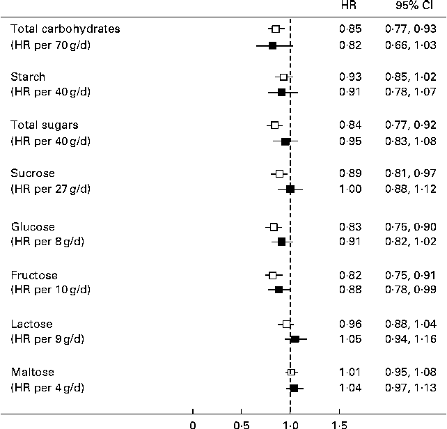 In the residual method, the energy-adjusted intake of each nutrient (g/d) was entered into separate models as a continuous variable and was adjusted for total energy intake. The HR of diabetes was inversely associated with a standard deviation higher intake of total carbohydrates, total sugars, sucrose, glucose and fructose in models adjusted for age and sex (Fig. 1). However, in multivariable analyses, total sugars and sucrose were no longer associated with diabetes risk, but there was a significant inverse association of diabetes risk with fructose and a borderline significant inverse association with glucose and total carbohydrates (Fig. 1).