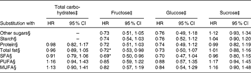 Table 3 Hazard ratios (HR) of diabetes for substitution of 5 % energy intake from total carbohydrates, fructose, glucose or sucrose with isoenergetic amounts of other energy-producing nutrients† (Hazard ratios and 95 % confidence intervals)