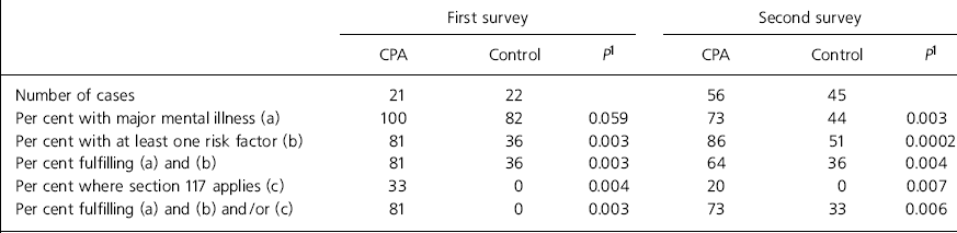 At the first survey there were no differences between CPA patients and controls in terms of age, sex, proportion from ethnic minorities, those living alone or unmarried and diagnosis. However, CPA patients were more likely to have involvement of social services (P=0.001), a history of previous admissions (P=0.0001), a longer period of contact with the service (P=0.004) and greater psychotropic drug prescription (P=0.026) than controls. At the second survey only social services involvement (P=0.021) and the proportion of patients living alone (P=0.031) differentiated the two groups.