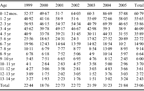 Table 1 shows hospitalization rates by age and year. Hospitalization rates decrease with age. The highest incidence of hospitalization corresponds to the youngest age group (0–12 months), while the lowest incidence is found in the oldest age group (13–14 years). The incidence of the youngest age group is almost 30-fold higher than the oldest one. In 2004 there was a significant increase of all the age rates, especially in the younger groups.