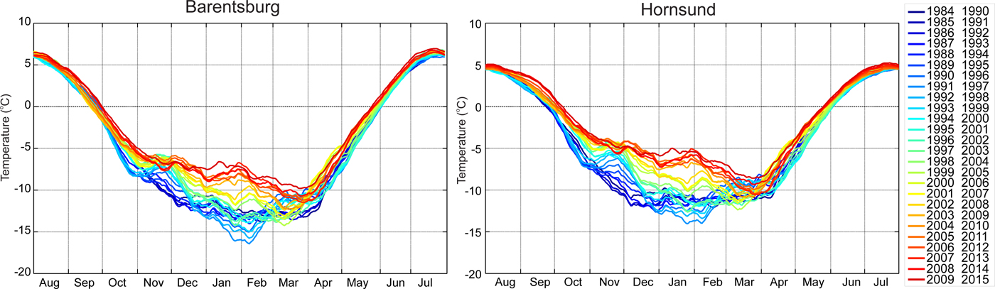 Fig. 10. Visual representation of the MASH results for daily air temperature at Barentsburg and Hornsund stations. Original time series cover the period N y = 32 snow seasons, from 1984/85 to 2015/16; therefore, MASH is composed of N h = 26 horizons. Each series represents a 7-year average of daily air temperature beginning in the year indicated.