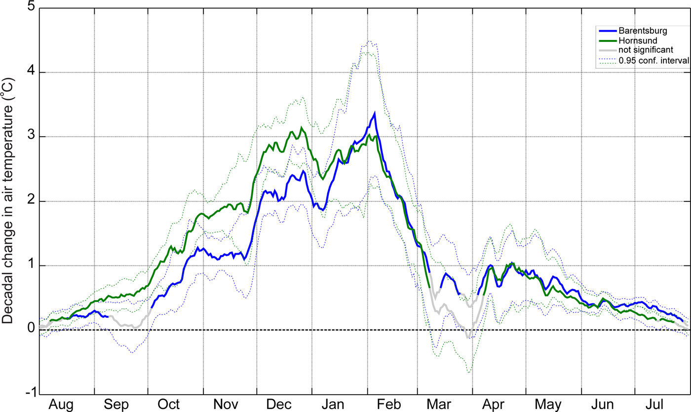 A comparison of estimated trends between Barentsburg and Hornsund indicates that larger increases in air temperature occurred at Hornsund (green line) than at Barentsburg (blue line) in September, November, October, December and first half of January. In other months, the estimates of changes for both stations are similar.