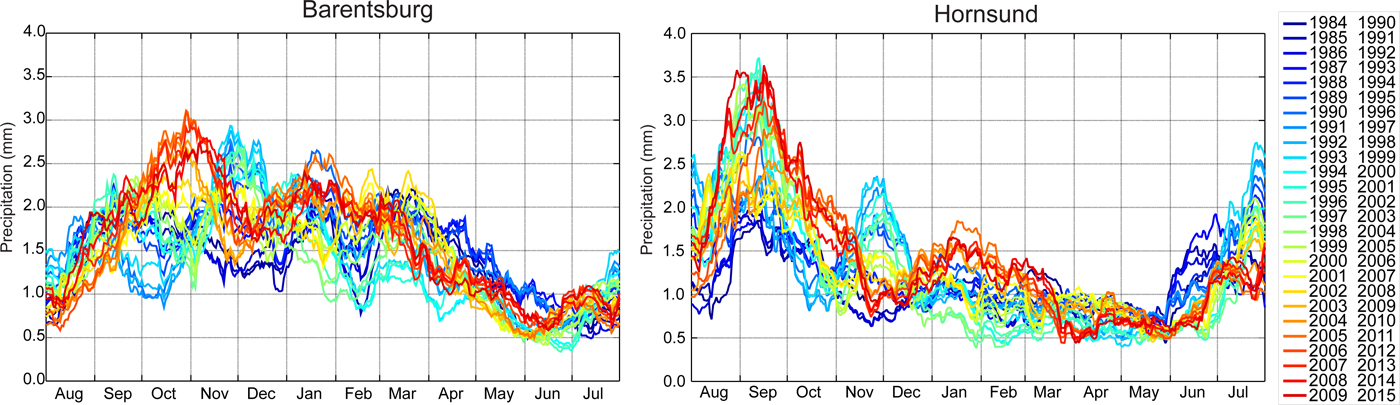 A comparison of MASH-smoothed annual runs of daily precipitation for the 1 August 1984 to 31 July 2016 period at Barentsburg and Hornsund stations is presented in Fig. 12. Dark blue lines represent observations from the 1980s and 1990s, while red lines indicate more recent data. In both cases (Barentsburg and Hornsund), changes in seasonality of precipitation are visible. However, there are differences between stations. At Barentsburg station the maximum precipitation is observed recently at the end of October, while at Hornsund the maximum occurs in September. In addition, these maxima are larger for Hornsund (3.5 mm) than Barentsburg (3 mm). Daily sums of precipitation smaller than 1 mm are observed in August, May, June and July at Barentsburg and at the end of November, in the second part of March, and during April, May and June at Hornsund.