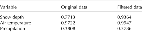 Table 1. Pearson correlation coefficients for the comparison of time series (of snow depth, air temperature and precipitation) for Barentsburg and Hornsund stations for the 1 August 1984 to 31 July 2016 period, for original and MASH-filtered data