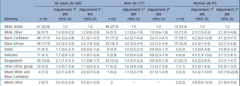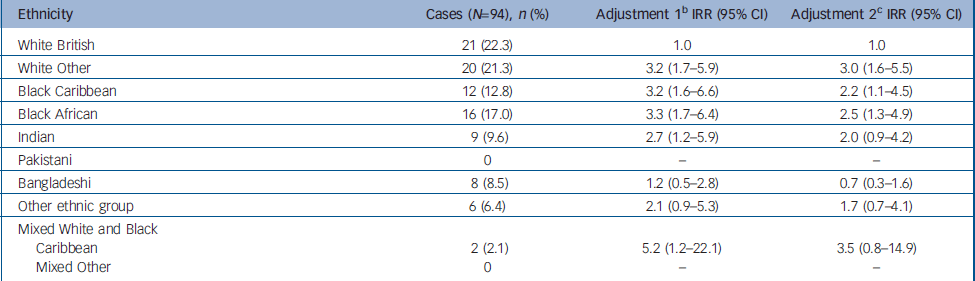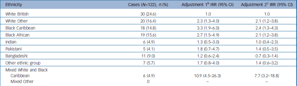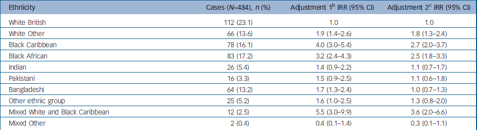 Table 1 Incidence rate ratios (IRR) of all clinically relevant DSM–IV psychoses in the East London First-Episode Psychosis Study population by ethnicitya