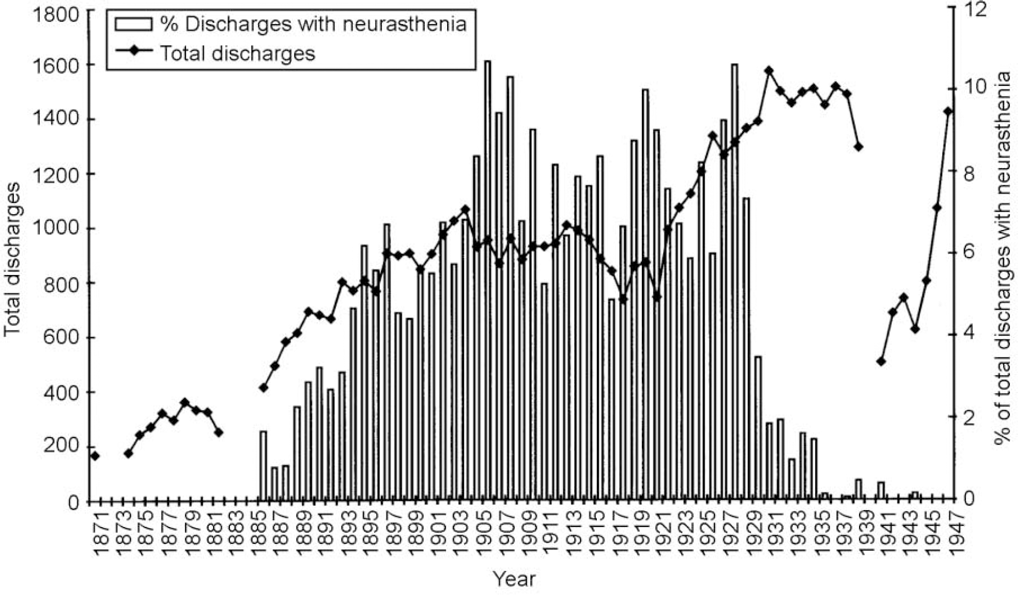 The bulk of this study focused on detailed reading of the annual reports. All changes in the classificatory system of ‘functional disorders’ were recorded. A paradox database was used to record for each year the number of neurasthenia diagnoses and the numbers of all other functional diagnoses, by gender. In order to have a denominator total discharges were recorded for each year. To enable comparison with a usually unambiguous organic diagnosis I recorded the number of brain tumour diagnoses for each year by gender.