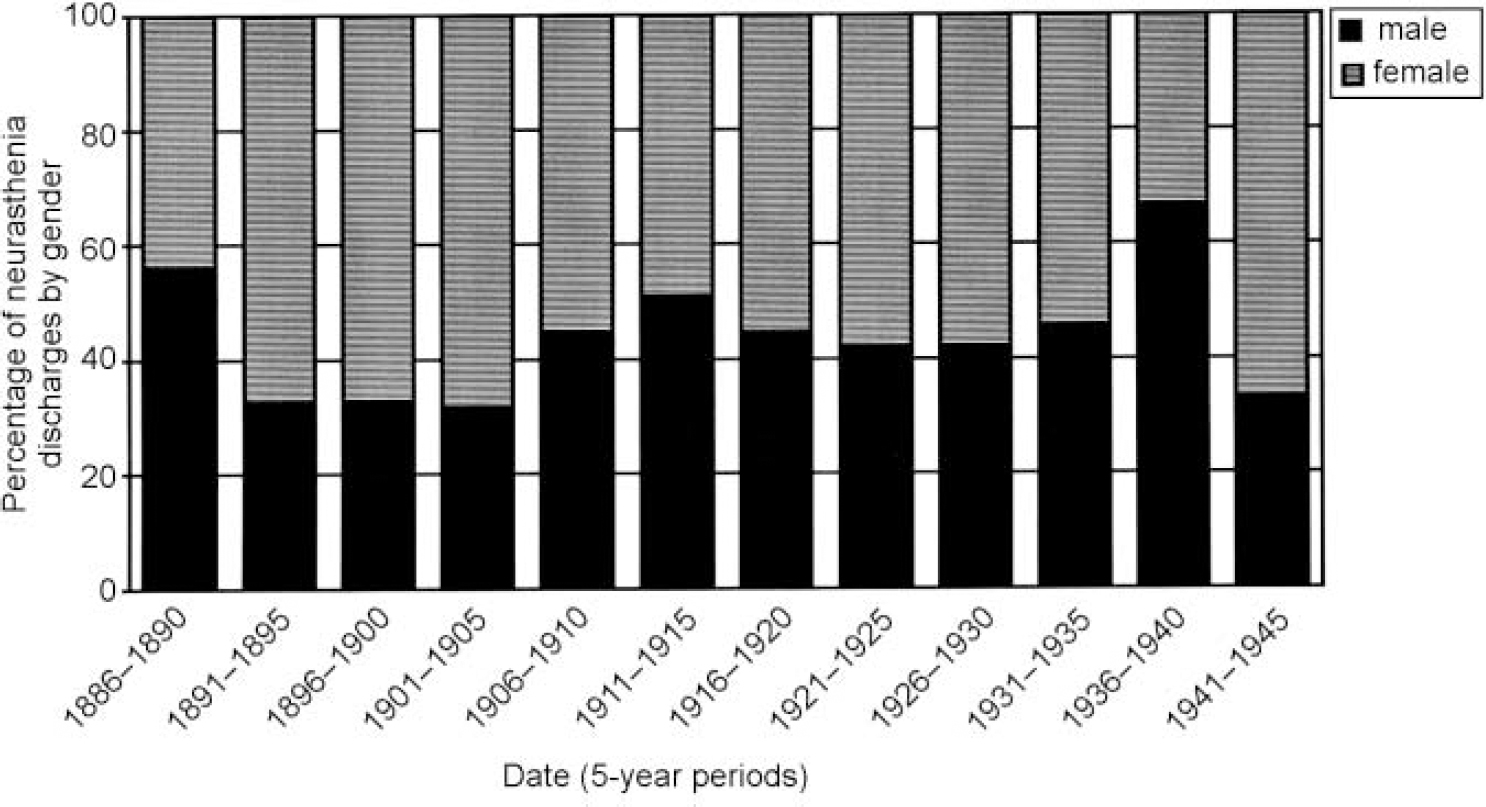 The data on gender in Fig. 2 dispel the second myth, that neurasthenia was largely a female illness, and so do not support the second hypothesis. When the diagnosis first appears the gender split is about 50/50, and even though the proportion of males falls to a low in 1891-1905, it is never lower than about one-third. The male prevalence then increases until there is a slight male excess in 1911-1915. (This excess actually continues into the next 5-year time block until 1918, but then a female excess returns so overall the period 1916-1920 shows a slight female excess.) The increase in male neurasthenia during the war years is almost certainly explained by its occurrence in servicemen returning from the Western front. Between 1914 and 1918 one-third of the beds available at the hospital were used for military cases (Queen Square Hospital Annual Reports, 1914-18), and the medical registrars' reports comment on the high frequency of functional disorders among this group. The number of males affected just after the war is probably an underrepresentation, as in 1918 the hospital opened a special house for the treatment of servicemen with neurasthenia, and many more men would have been admitted there. However, the war does not entirely explain the increased male prevalence of neurasthenia, as it is already more common in men by 1910 (56% male, 44% female).
