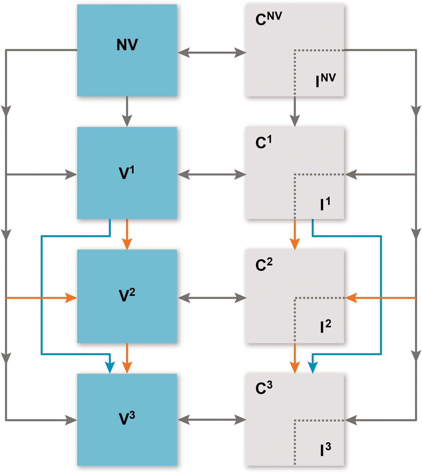 Fig. 1. Overview of model. C, carriage; I, invasive pneumococcal disease; NV, no vaccine; V1, received one primary dose; V2, received two primary doses (only applicable to the 2 + 1 schedule); V3, received the booster dose. Compartments relevant to vaccine doses (both carriage and susceptible) are further stratified into ‘no immunity’ and ‘partial immunity’ induced by vaccine effectiveness, age group and serotype group. Orange arrows indicate 2 + 1 schedule dynamics and blue arrows indicate 1 + 1 schedule dynamics. Grey arrows are applicable to the dynamics of both vaccine schedules.