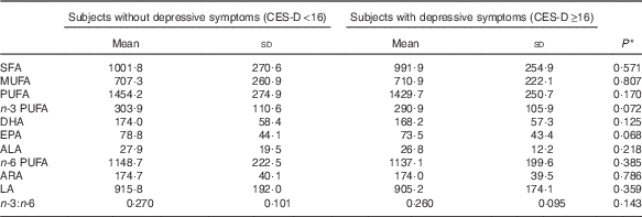 CES-D, Center for Epidemiologic Studies Depression Scale; n-3 PUFA, sum of ALA, EPA, DPA and DHA; ALA, α-linolenic acid; n-6 PUFA, sum of LA, γ-linolenic acid, eicosadienoic acid, dihomo-γ-linolenic acid, ARA and docosatetraenoic acid; ARA, arachidonic acid; LA, linoleic acid.