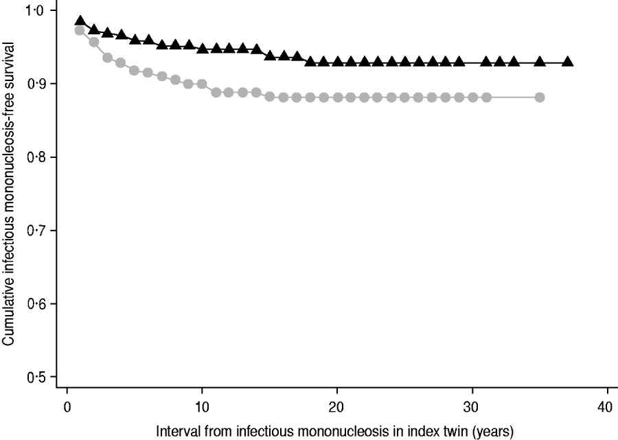 Because identical (monozygotic; MZ) twins and fraternal (dizygotic; DZ) twins share 100% or, on average, 50% of the genotype, respectively, a comparison of twin concordance by zygosity can be used as a crude indicator of heritable susceptibility [Reference Martin, Boomsma and Machin12]. In addition, twins are matched on early childhood environment, important because early childhood EBV infection may mitigate risk of later IM. For this reason we sought to investigate the heritability of IM in twin pairs identified from a population-based registry of California-born twins.