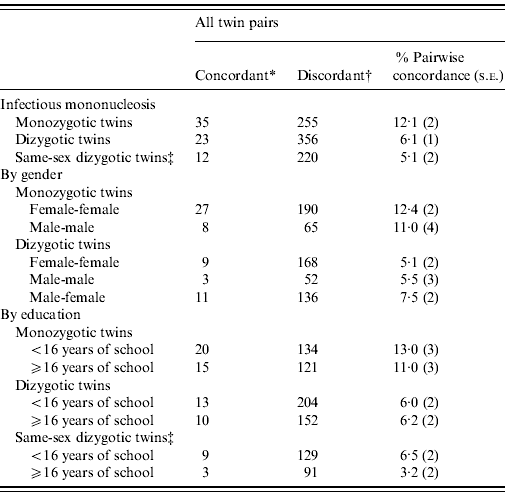 Concordance for IM in MZ twins was twice that of DZ twins when considered together and separately by sex and education level. Because age at exposure to EBV is a determinant of IM, it is possible that the higher MZ concordance could be due to more shared exposures in early childhood and adolescence in MZ compared to DZ twins. Exposure to infections transmitted by the oral or respiratory route requires person-to-person contact, and therefore the behavior of twins, parents and others plays a role. Critiques of twin studies have argued that MZ twins are treated more similarly by parents and peers, and thus have more similar early childhood exposures compared to DZ twins, which could contribute to higher trait concordance in MZ compared to DZ twins [Reference Evans and Martin19–Reference Kendler22]. However, because IM concordance in MZ pairs was double that of DZ pairs, and because MZ twins share on average twice as many genetic characteristics as DZ twins, a genetic contribution to IM aetiology is also a plausible explanation [Reference Evans and Martin19, Reference Eaves, Foley and Silberg20]. If concordance was based mainly on environmental factors (e.g. time of exposure, number of potential contacts), we might expect concordance to differ by sex, because male and female twin pairs have different levels of shared behaviour, including interpersonal contact, and therefore exposure [Reference Hamilton23]. Instead, we observed that the twofold higher concordance for MZ twin pairs was similar for both male and female pairs, consistent with an underlying sex-independent genetic susceptibility. The higher concordance in opposite-sex vs. same-sex DZ pairs is probably a reflection of chance variation.